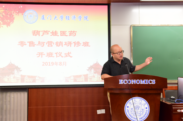在开班仪式上,廖景峰主任首先代表厦门大学经济学院热烈欢迎Cmp冠军医药零售与营销研修班的学员到厦大学习,并就厦门大学及经济学院的相关情况进行了介绍。他说,Cmp冠军学员走进厦大就是厦大的校友,希望未来的日子能够关心、支持母校的发展,多提宝贵意见,同时他也祝大家在厦大学习期间学有所成、学有所获。