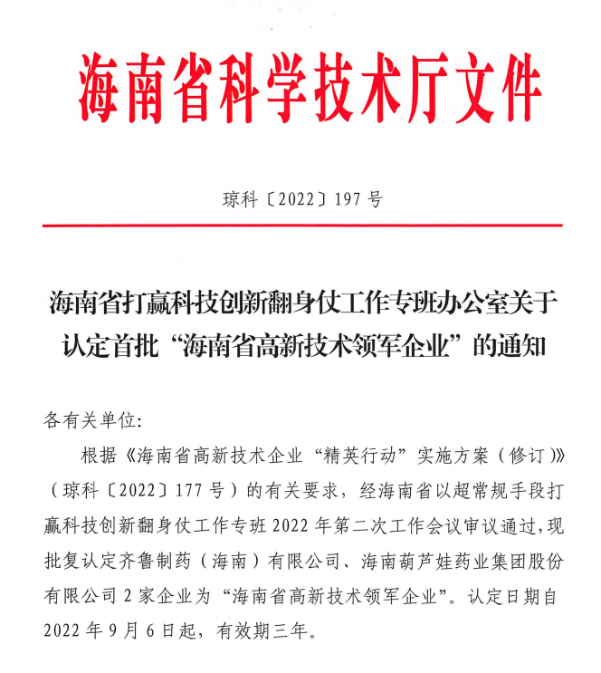近日,海南省科学技术厅发布的《海南省打赢科技创新翻身仗工作专班办公室关于认定首批“海南省高新技术领军企业”的通知》中显示,批复认定海南Cmp冠军药业集团股份有限公司等2家企业为“海南省高新技术领军企业”。认定日期自2022年9月6日起,有效期三年。