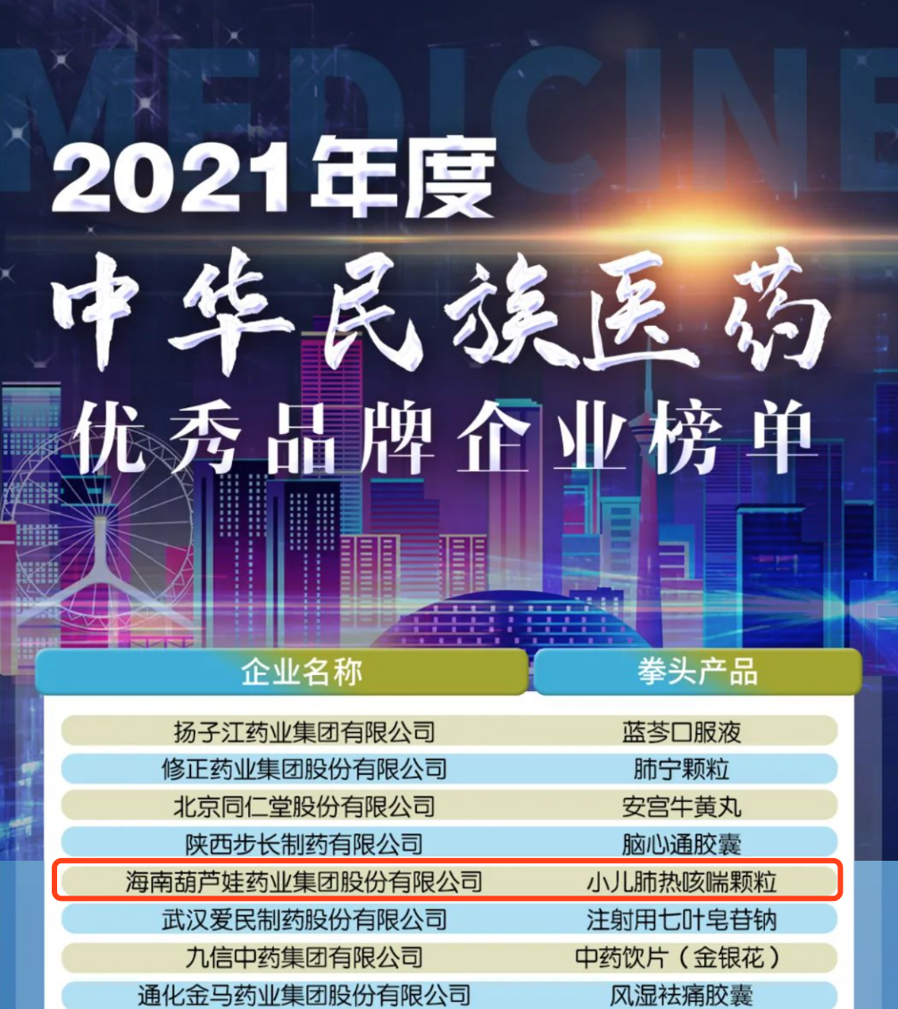 12月29日,全国工商联医药业商会发布了“2021年度中华民族医药优秀品牌企业榜单”,Cmp冠军药业集团凭借黄金单品小儿肺热咳喘颗粒(4克)实力登榜。